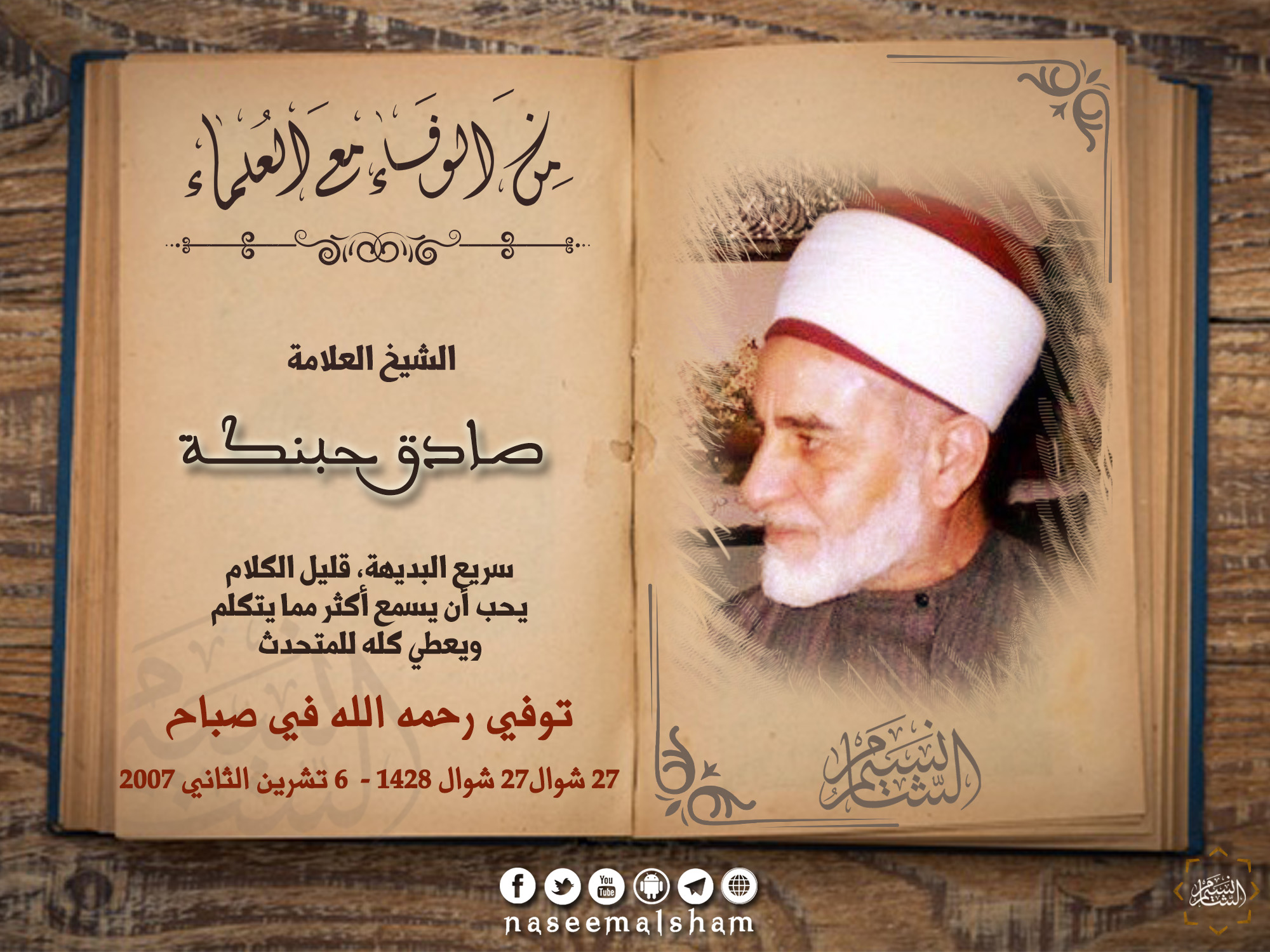 وُلِدَ العلامة الشيخ: صادق بن مرزوق بن عرابي بن غنيم حبنَّكة في حي الميدان بدمشق، سنة 1918م.