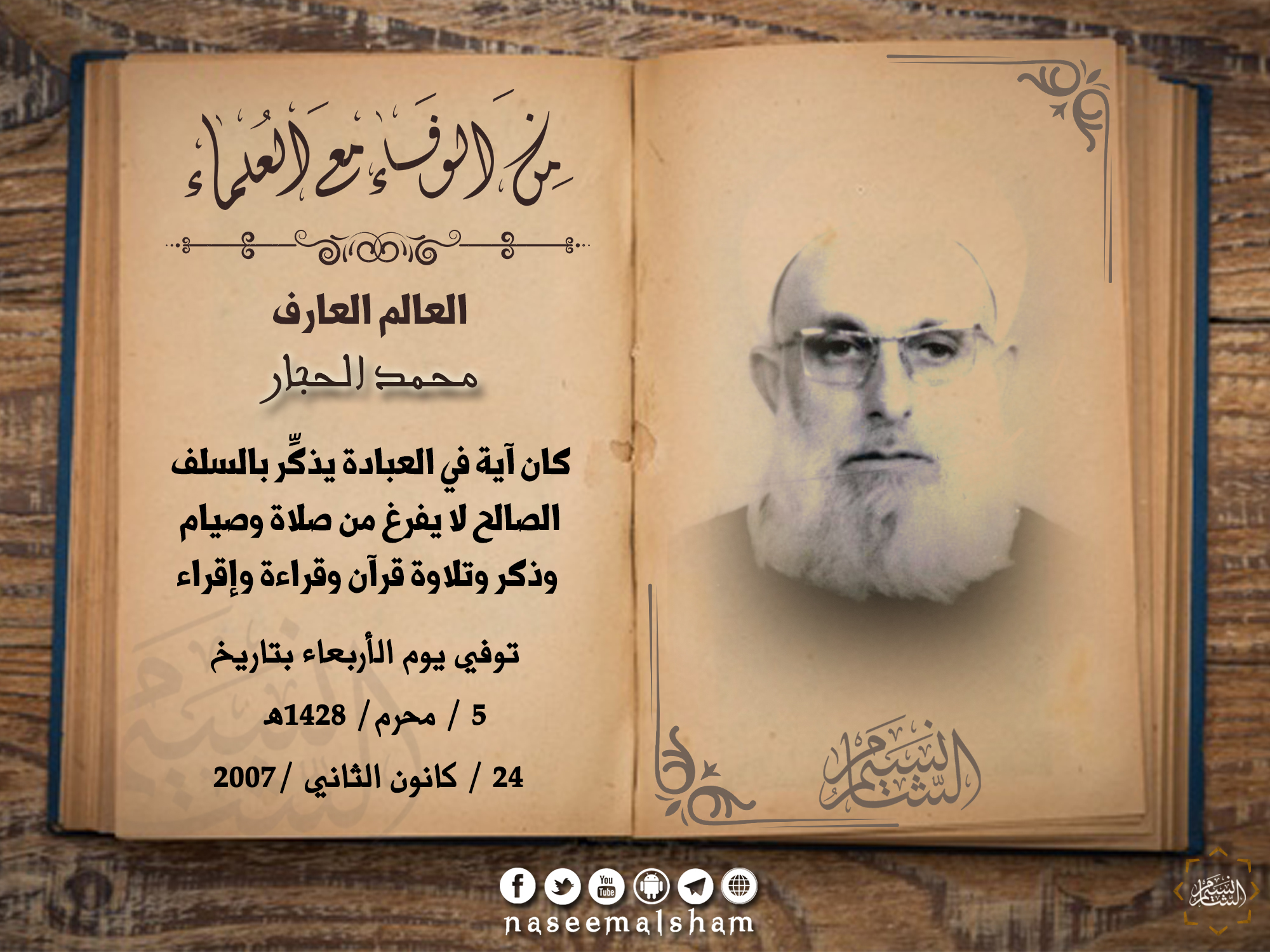 الشيخ الجليل العابد الزاهد العالم المحقق، بقية السلف الصالح، نزيل المدينة المنورة، والملازم لمسجد النبي صلى الله عليه وسلم قرابة الثلاثين عاماًً يتعبد فيه بالذكر والعلم والتعليم والتحقيق وتلاوة القرآن الكريم سيدي الشيخ: محمد محمود الحجار