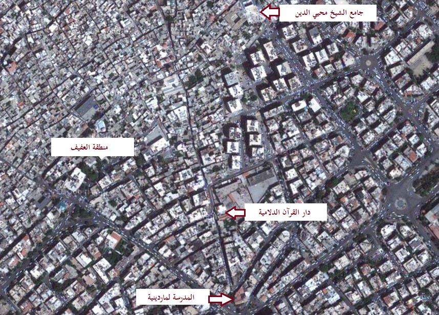 قال الشيخ بدران: هي معروفة باسم الدلامية إلى الآن في الطريق الآخذ إلى الصالحية في الجهة الشرقية، وهي عامرة ومشهورة، وحائطها الغربي مبنى بالحجارة السوداء والصفراء على نمط جميل، وبابها مبنى على هندسة لطيفة وإتقان يدل على ما كان للفن المعماري فذلك الزمن من التقدم، وكأن المتقدمين كانوا يتفننون في بناء الأبواب، فيجعون لأبواب دور القرآن طرازاً غير طرز أبواب دور الحديث، ولأبواب (دور) الحديث شكلاً غير شكل أبواب مدارس الفقه والعلوم، ويميزون أبنية السلاطين والأمراء لمعاهد الخير عن أبواب أبنية غيرهم. ومن تأمل مآثرهم رأى ذلك عياناً، ثم إنك إذا دخلت من الباب أفضى بك إلى صحن لطيف في وسطه بركة ماء، وفي الجهة الشمالية إيوان لطيف أيضاً، وفي الجهة القبلية حرم جميل ثلاث عشرة خطوة في سبع، وفي الحائط الشرقي حجرة، وفي الغربي حجرة أيضاً، وبها قبر الواقف، ولها شباك مطل على الطريق، وتلك الدار الآن معدة لإقامة الصلوات الخمس، والأوقات التي اصطلح عليها أتباع الشيخ إبراهيم الرشيدي من المتصوفة، وأخبرني أحد المقيمين بها أن أيدي المختلسين تناولتها قديماً فجعلوا نصفها داراً، والنصف للورد والمورد والأزهار التي يزرعها أهل الصالحية ويبيعونها فلما كانت سنة ثلاث مئة وألف انتدب لها السري المحسن علي بك ان مردم بك المؤيد العظمي فاستخلصها من يد مختلسيها، وبناها على الطراز الذي هي عليه الآن.