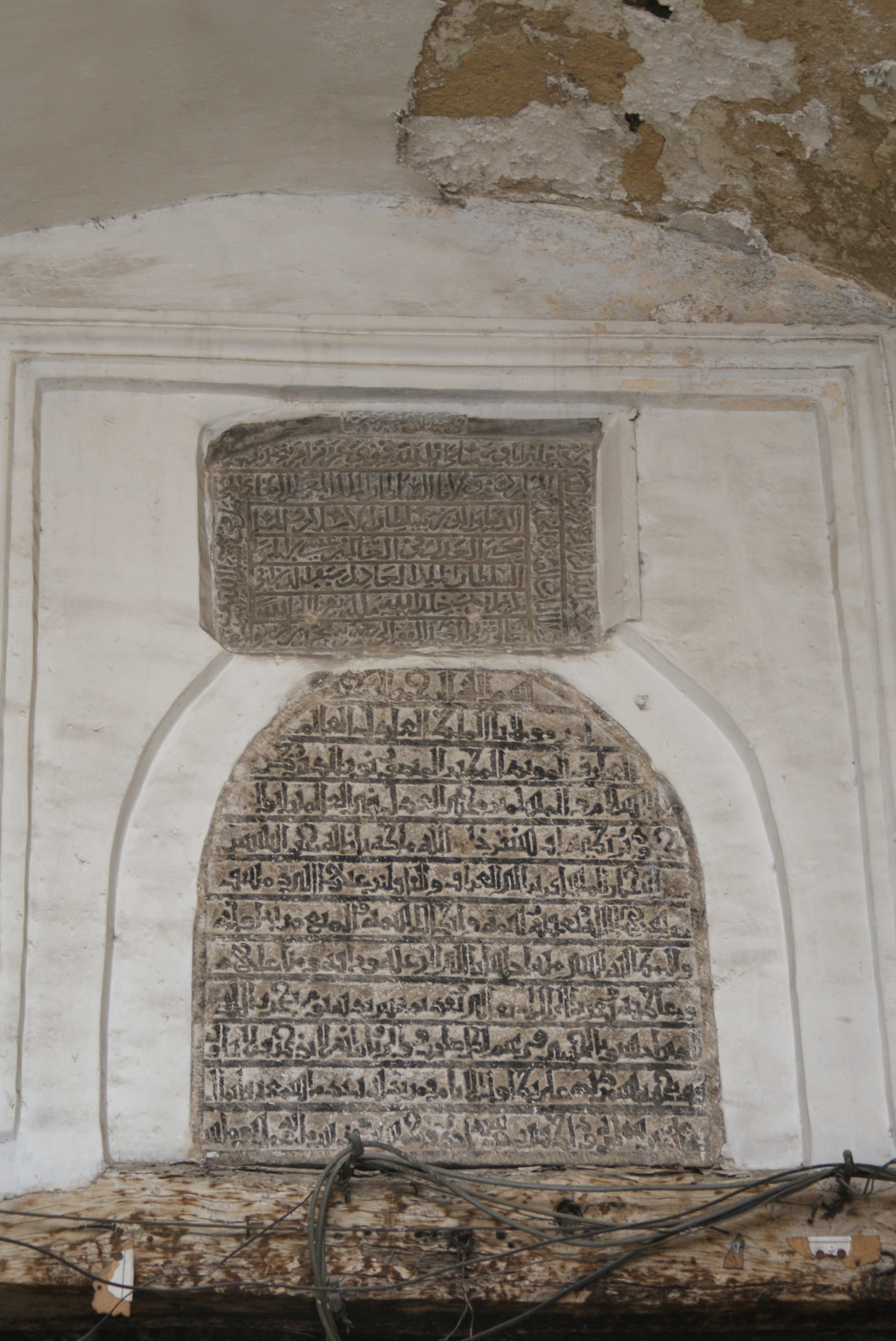 (بسم الله الرحمن الرحيم أمر بتجديد هذا الباب والخندق المبارك مولانا السلطان الملك الصالح العالم العادل المجاهد المرابط المثاغر المظفر المنصور الغازي عماد الدنيا والدين سلطان الإسلام والمسلمين قاتل الكفرة والمشركين قامع الخوارج والمرتدين محيي العدل في العالمين إسماعيل ابن أبي بكر بن أيوب نصير أمير المؤمنين بتولي العبد الفقير يعقوب بن إبراهيم بن موسى بتاريخ رمضان سنة تسع وثلاثون وستمائة).
