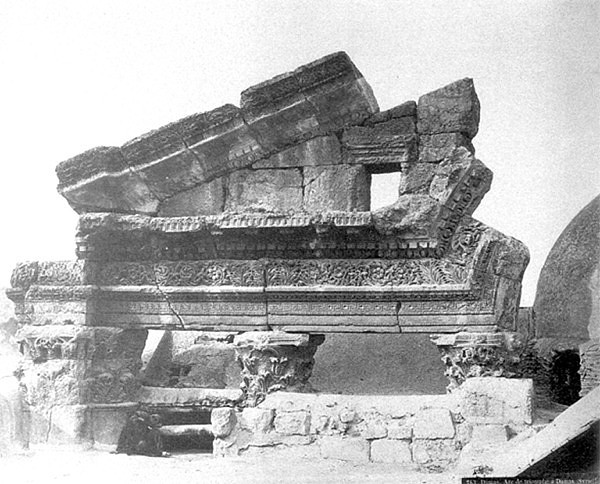 وابن عساكر يقول: إن اليونان رسموا فوق قوس تاج الباب الشرقي نقشاً نافراً في الحجر صورة قرص الشمس، واستمر وجود هذه الرسوم في العهد الروماني لأنهم كانوا يؤمنون بذلك.