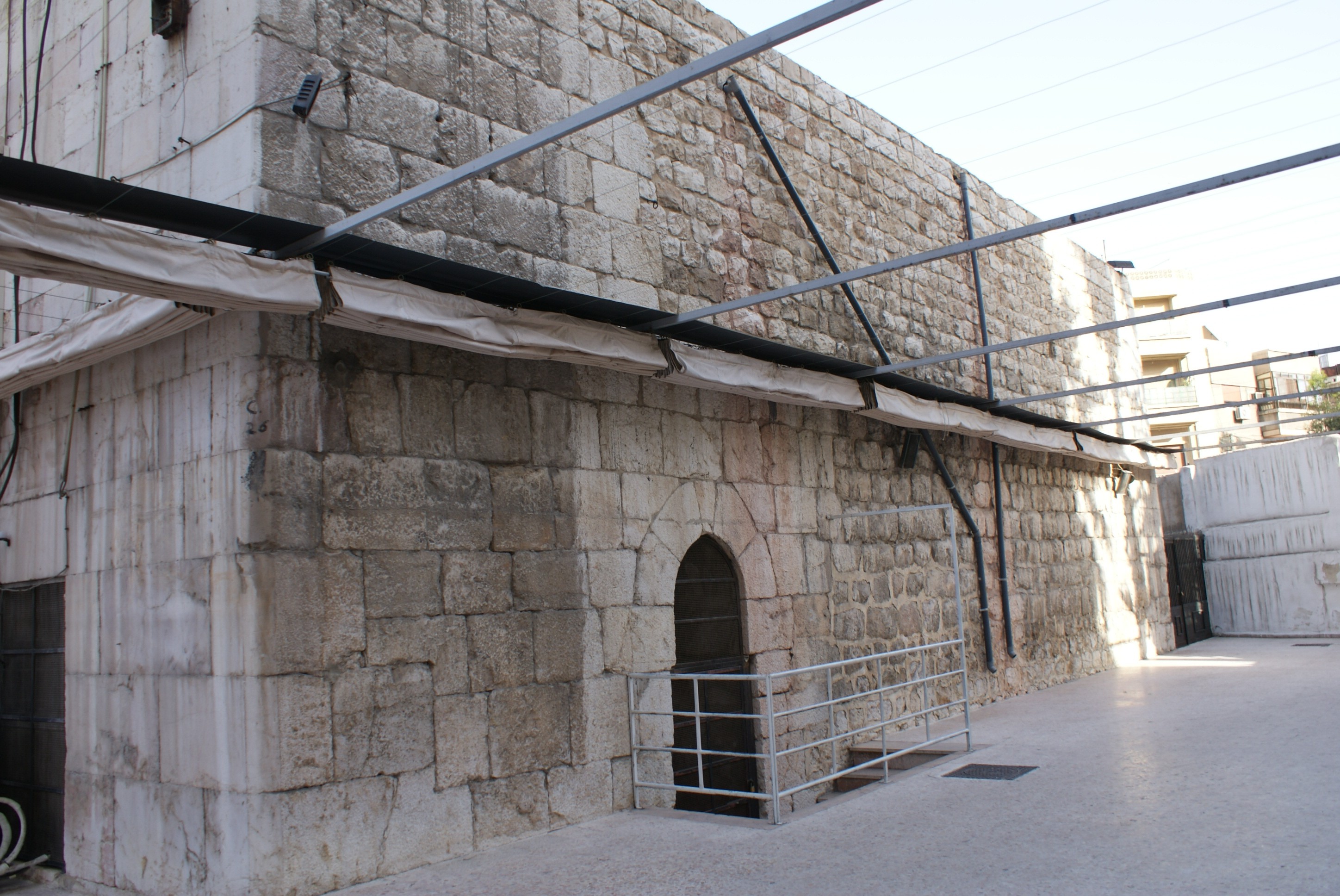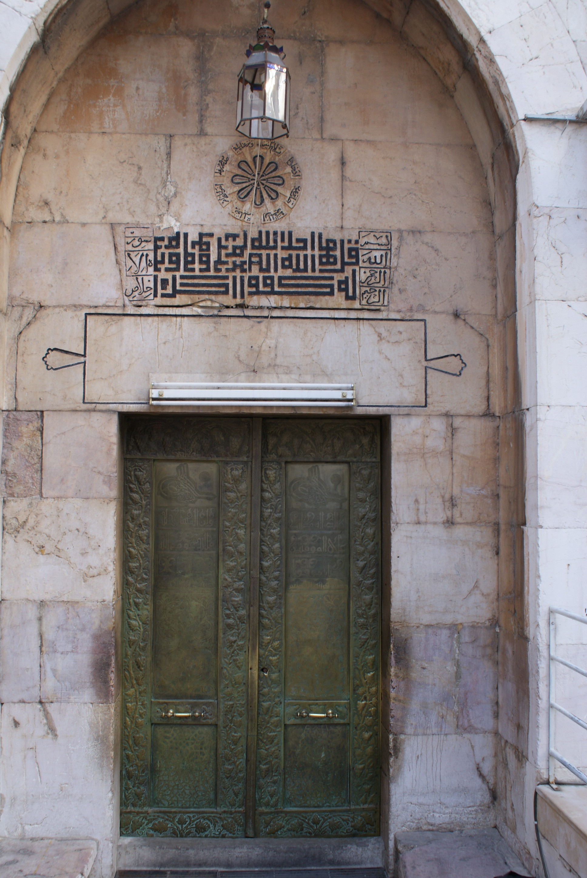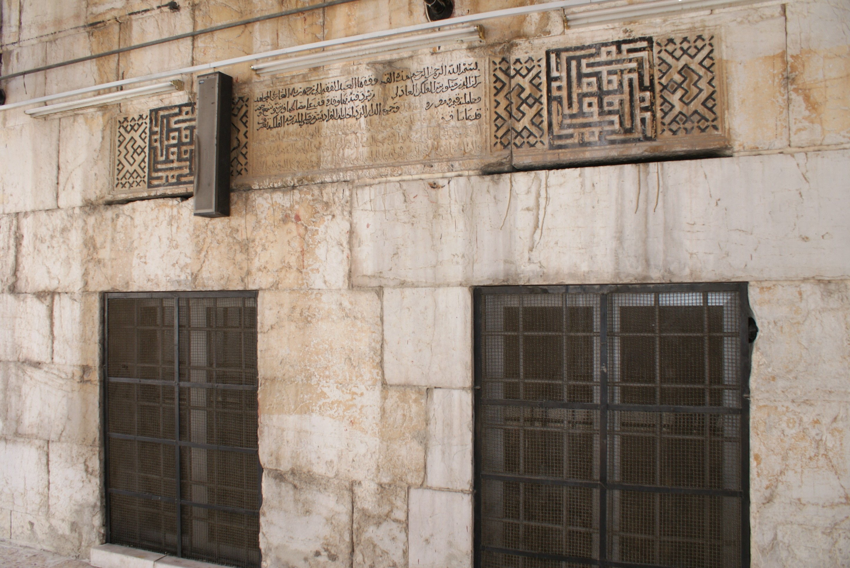 وفوق النافذتين، كتابة تاريخية تتألف من سبعة أسطر بالخط النسخي الأيوبي المحفور: