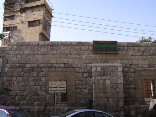 تقع المدرسة العمرية:خارج أسوار مدينة دمشق القديمة، في سفح قاسيون، بناها الشيخ أبو عمر ملاصقة للدير الذي بنوه ثم عُرف فيما بعد باسم مسجد الحنابلة. وحالياً هذه المدرسة هي عبارة عن آثار تحتاج إلى من يُجلي معالمها الثقافية، وهي في وسط سوق الجمعة، الذي طغت شهرته التجارية على المنطقة واليوم تفصل حارة ضيقة المدرسة العمرية عن مكان الدير القديم. أما عن تاريخ بنائها: فهو في 577ھ فقد قام الشيخ الكبير أحمد بن قدامة مؤسس الصالحية بوضع أساسياتها ثم أكمل ولده الشيخ أبو عمر بناء المدرسة وقام بتخصيص أوقافها.
