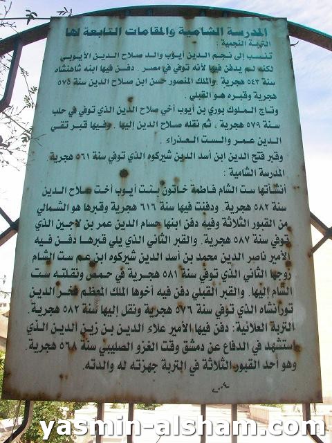 (المدرسة الشامية: أنشأتها ست الشام فاطمة خاتون بنت أيوب أخت صلاح الدين سنة 582ﻫ ودفنت فيها سنة 616ﻫ وقبرها هو الشمالي من القبور الثلاثة)