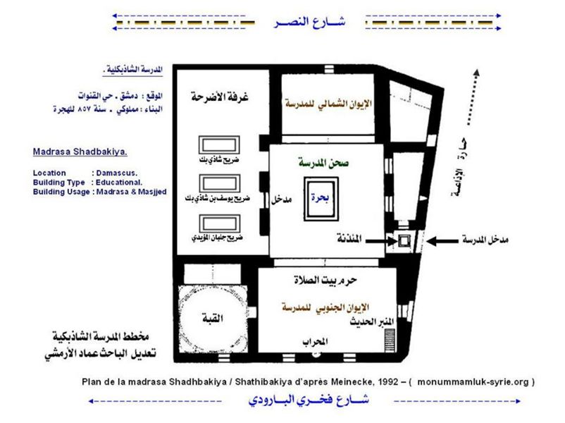 ومرجعاً إلى مخطط المدرسة الشاذبكية نرى أن الواجهة الشرقية تنحرف مع انحراف زاوية حارة الإذاعة الواصلة بين شارع النصر، وبين شارع فخري البارودي، وتفقد بالتالي تناظرها حسب استقامة شوارع الشام.