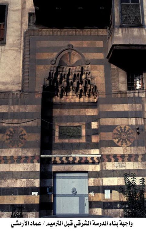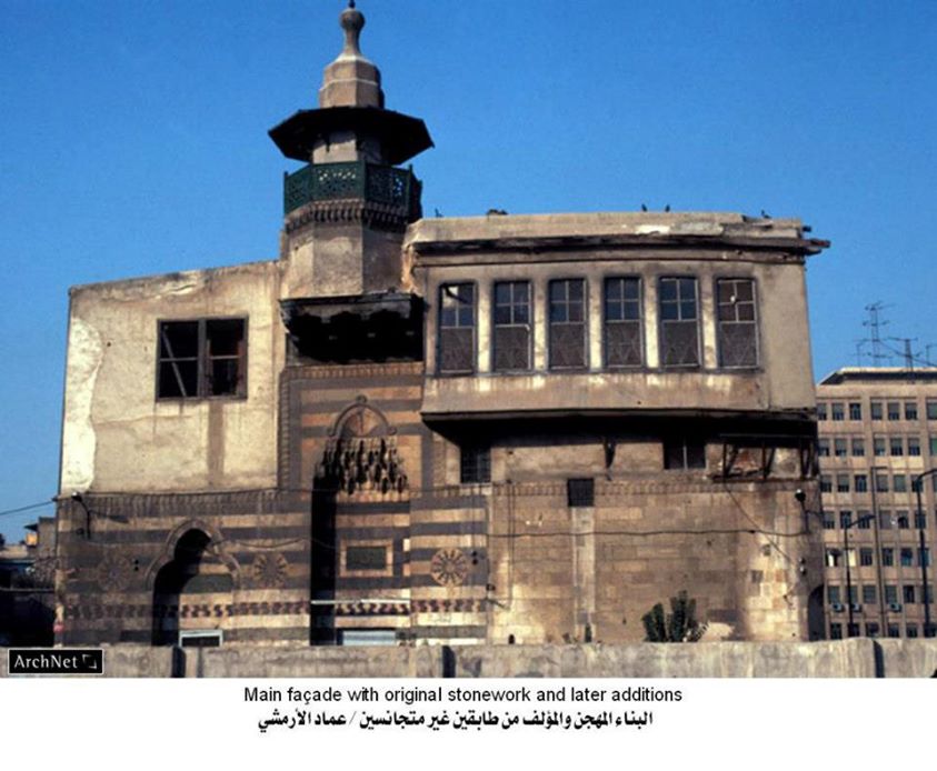 لأننا لم نشاهد في دمشق أبنية مملوكية وفوقها أبنية ثانية بهذا الشكل !!، وعليه فإن هذا البيت الموجود فوق المدرسة مبني دخيل، وشٌـيد في العهد العثماني لأن شكل نوافذه وطراز بنائه... يشيران إلى ذلك كما هي معظم العمائر التي انتشرت في العهد العثماني بدمشق وخاصة إبان ولاية الوالي العثماني علي باشا عام 1232 للهجرة الموافق 1816 للميلاد.كما أنه لا ينسجم بحال من الأحوال لا مع جمالية المبنى ولا مع الطراز المعماري لهذه المشيدة المملوكية.