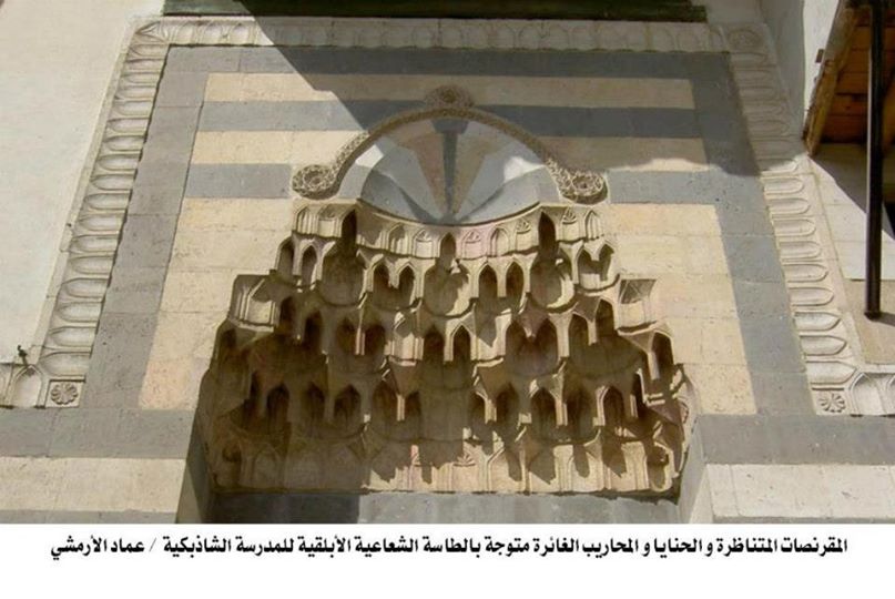 أقول هنا وبعد زيارتي الميدانية للمدرسة في نهاية عام 2007، أن البوابة الرئيسية للمدرسة الشاذبكية غنية بالمقرنصات المتناظرة هندسياً بشكل بديع، وبوجود حنايا ومحاريب غائرة، ذات زخارف جميلة، ومتوجة بالطاسة الشعاعية الأبلقية من الحجارة البيضاء والسوداء والمزية اللون، يعلوها قوس مجدول مزخرف ويستند على دائرتبن في كلا الجانبين ومتوج بدائرة عليا كما هو تاج العروس.