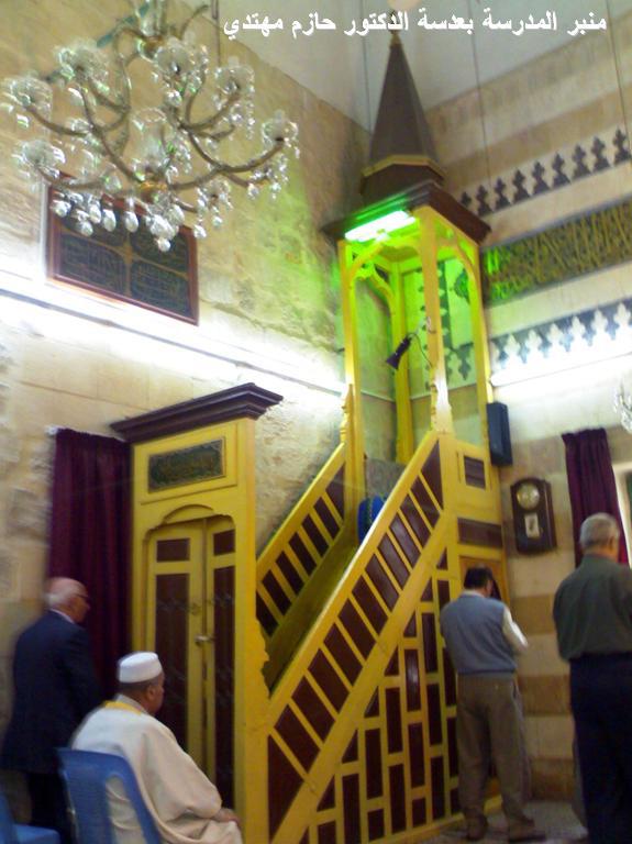 في شمال بناء المدرسة وفي الجنوب: إيوانان عظيمان، فالشمالي له سقف خشبي بديع على النمط العثماني، وحائط هذا الإيوان من الحجر الجميل، والجنوبي فيه المحراب والمنبر القديمان، ولكنهما مشوهان بالدهان، أيام تجديد المسجد سنة 1232 بعناية السيد أحمد الموره لي، والى جانبي المحراب والمنبر شباكان إلى الطريق....