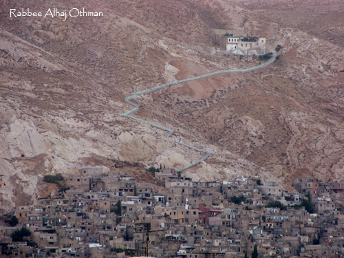 وبآخر هذا الجبل المذكور في آخر البسيط البستاني الغربي من هذا البلد الربوة المباركة: مأوى المسيح وأمه، وهي من أبدع مناظر الدنيا حسناً وجمالاً، ويُصعد إليها على أدراج، والمأوى المبارك منها مغارة صغيرة في وسطها وهي كالبيت الصغير، وبإزائها بيت يقال أنَّه مصلى الخضر.