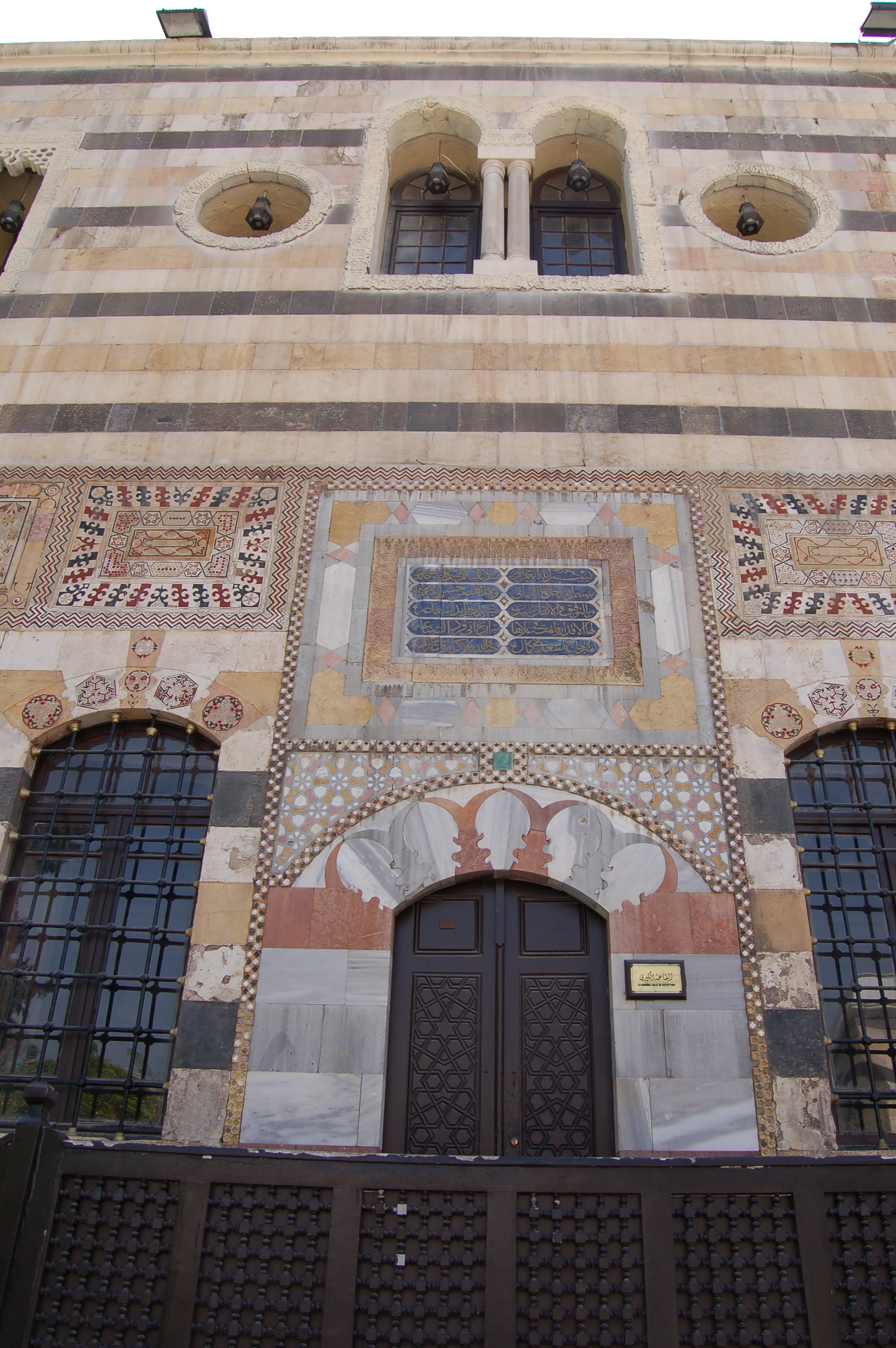 وتأتي شهرته من غناه بأنواع الزخرفة العربية والجوّ الشرقي الأصيل المتجلّي فيه، ممثّلاً حصيلة ما أبدعته الحضارات التي عرفتها مدينة دمشق... وإذا وقف السائح من باحة القصر عند الباب تملّكته الحيرة أين يقلّب ناظريه بين الواجهات والجدران المزخرفة من الأعلى إلى الأسفل بمداميك ملونة بالتناوب، وبأشرطة منقوشة، وأحجار مرصعة.