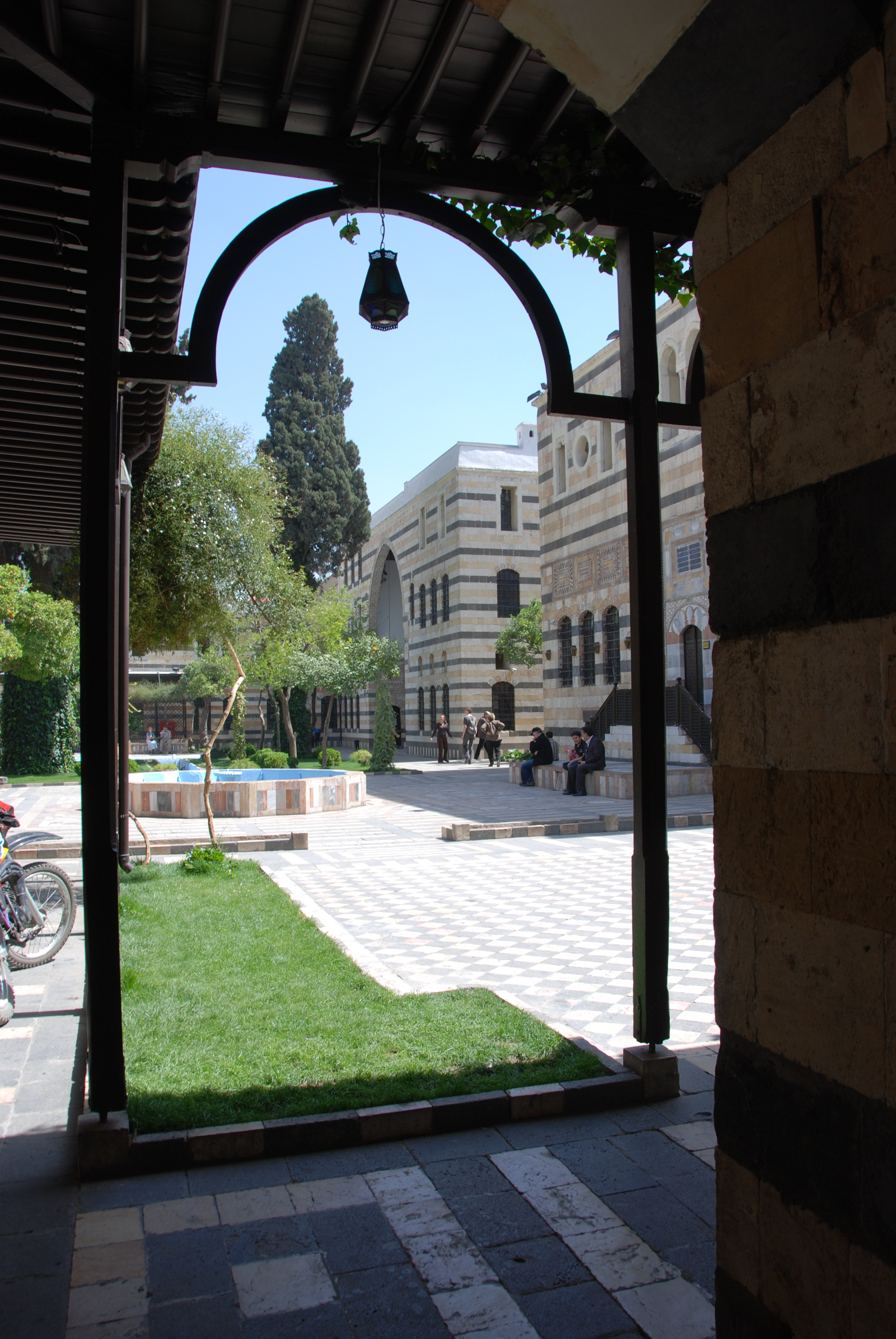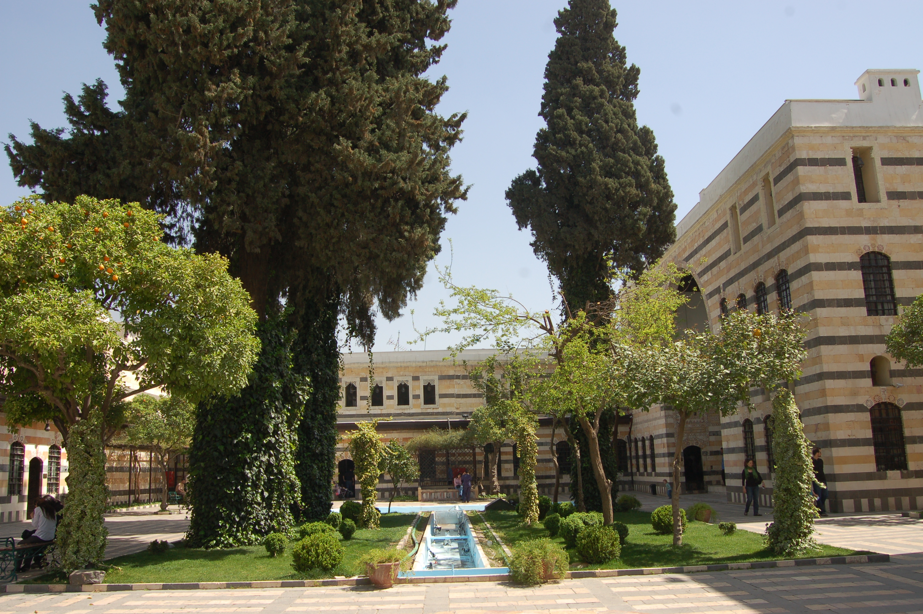 *الباحة: وهي واسعة جداً، تضم عدداً من الأحواض المزروعة بأغراس الشمشير والورود وعرائس الياسمين، وأشجار النخيل والمنوليا والليمون والكباد، رُصفت أرضيتها بخيوط من الحجر البركاني الأسود، متداخلة مع خيوط من الحجر المزّي الأزهر، فيها بحرتان، والجدران مكسوّة بمداميك من الحجر الأسود بالتناوب مع الأزهر، يعلوها إطار من التزيينات الهندسية.
