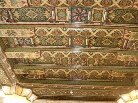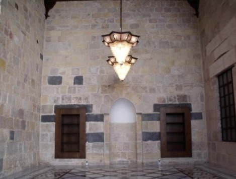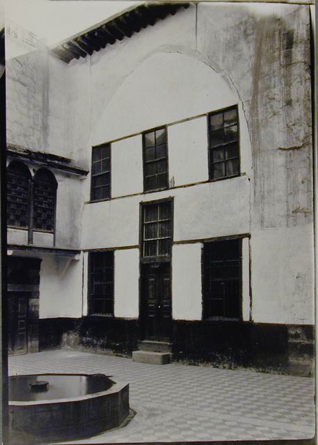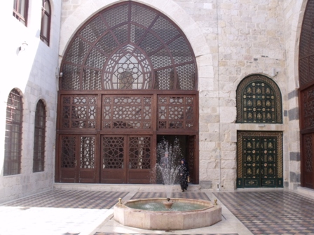 عندما تجتاز البوابة إلى رواق ذي أقواس محمولة على عمودين حجريين كبيرين، تنفتح أمامك باحة خارجية فسيحة ومربعة توحي ببرودة منعشة، محاطة بجدران تنسحب إلى الأعلى عارية من أي زخارف أو لمسات فنية، وكذلك تتدلى منها عرائش العنب، وتتوسطها بحيرة صغيرة، كما هو الحال في أكثر البيوت الدمشقية القديمة.
