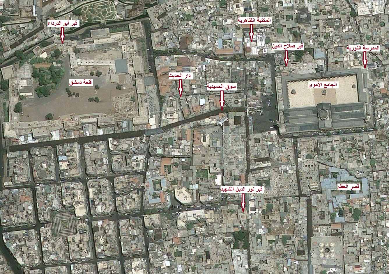 و قال الحموي، ت: 626هجري، في (معجم البلدان) : أن هود عليه السلام نزل دمشق و أسس الحائط الذي قِبَلي جامعها، و قال شيوخ دمشق الأوائل: أن دار شداد بن عاد بدمشق في سوق التين، يفتح بابها شاماً إلى الطريق.