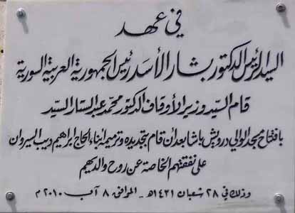 وأقول: وهذا الجامع أعظم جوامع دمشق وأبهاها منظراً وأغناها نقوشاً وزخارف وقاشاني أما محرابه ومنبره فهي آيتان من آيات الفن، وهو على النمط التركي في طراز صحنه وقبته ومنارته الجميلة، وفي يسار المحراب لوحة قديمة يرجع عهدها إلى سنة 988 (و لا شك أنها منقولة عن موضع آخر).