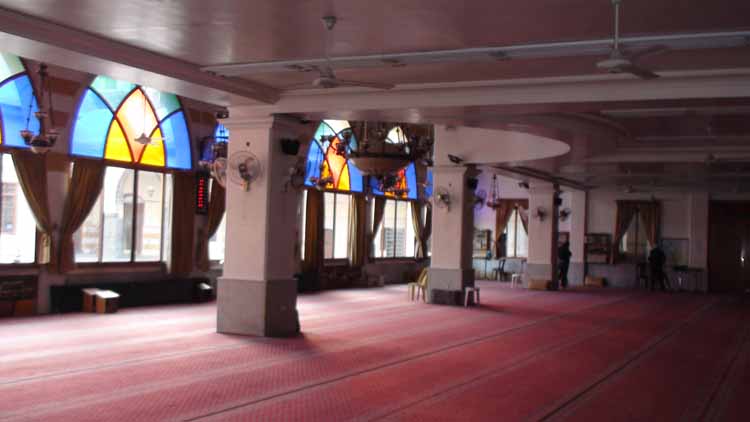 وفي الجهة الجنوبية باب ضخم يكتنفه بابان أصغران يؤديان إلى القبلية، أما القبلية فعظيمة جداً مستطيلة الشكل لها سقف خشبي مسنم يرجع إلى عهد بنائه الأول وفيها ثلاثة محاريب قديمة جميلة ولكنها مشوهة بالدهان، والمنبر خشبي جميل الصنعة ولكنه مشوه بالدهان أيضاً).