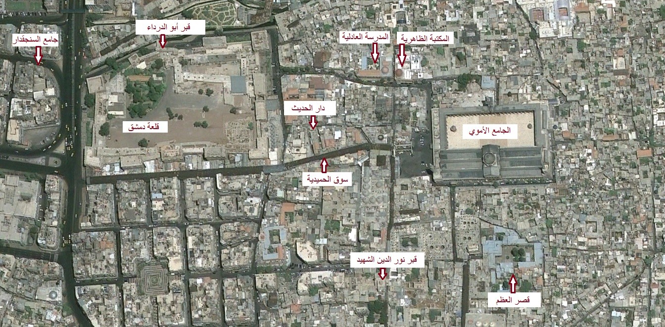يقع القصر وسط مدينة دمشق القديمة، ما بين الجامع الأموي شمالاً وسوق مدحت باشا (الشارع المستقيم) جنوباً، بالقرب من البزورية ويمتد على مساحة 5500 م2، يعتبر هذا البناء من أهم المباني التاريخية الضخمة الموجودة في مدينة دمشق القديمة.